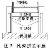 依据吊装方案,大部分构件在工厂内分段制作,现场拼装。为了保证吊装精度,现场依据工厂制作工艺图进行放样,并将其放样在刚性平台上,下面采用路基板作为拼装基础,在路基板上吊装胎架,保证刚架拼装时的精度,同时对焊接变形起到控制作用。拼装如图2所示。