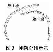 刚架分段基本以高低跨刚架分别作为一个吊装段,中间腹杆为散件吊装。每段达18t,分段如图3所示。分段吊装难度大,但此分段既减少临时支撑数量,又可减少空中对接焊缝数量,有利于保证焊接质量,同时可节省机械台班费用。