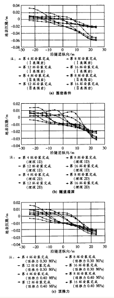 由各影响因素作用下地表纵向沉隆曲线随施工进程的分布变化规律可以看出,隧道所处围岩条件、埋深和顶推力等因素均将在较大程度上影响和制约着地表沉隆曲线的变化规律。围岩状况恶化或隧道埋深的减小都将引起隧道纵轴线正上方地表沉隆变化区域及变位量的显著增加;顶推力降低,隧道施工对地表的影响相应削弱。