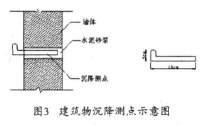 基点的埋设与地表下沉测量方法的埋设相同,埋设时先在建筑物的基础或墙上钻孔,然后将预埋件放入,孔与测点四周空隙用水泥砂浆填实。测点基本布设在被测建筑物的角点上,测点的埋设高度应方便观测,同时测点应采取保护措施,避免在施工和使用期间受到破坏,每幢建筑物上一般布置4个观测点,特别重要的建筑物布置6个~8个测点(测点的布置参照图3所示)。沉降值的计算与地表的沉降计算相同。