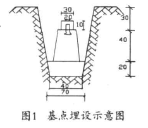 (1)基点埋设。首先,基点应埋设在沉降影响范围以外的稳定区域内;其次,应埋设至少两个基点,以便基点互相校核;基点的埋设要牢固可靠,采用标准地表桩,必须将其埋入原状土,并做好井圈和井盖。在坚硬的道面上埋设地表桩,应凿出道面和路基,将地表桩埋入原状土,或钻孔打入1米以上的螺纹钢筋做地表观测桩,并同时打入保护钢管套(如图1所示)。基点应和附近水准点联测取得原始高程,基点应埋设在视野开阔的地方,以利于观测。
