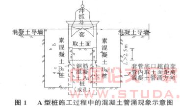 如图1所示,在A桩成孔过程中,由于B桩混凝土未凝固,还处于流动状态,B桩混凝土有可能从B桩,A桩相交处涌入A桩孔内,称之为“管涌”,克服“管涌”有以下几个方法: