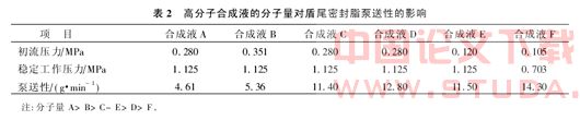 为保证盾尾密封脂的粘附性,盾尾密封脂组分中一般使用了高分子合成液,高分子合成液的分子量对盾尾密封脂泵送性的影响见表2。
