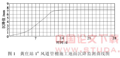 通过对地面沉降监测数据进行分析,在φ159mm管施工过程中,1#风道地面沉降比2#风道的沉降大,主要原因是由于采用水钻;钻头直径大于φ159mm管的直径,成孔后孔壁与管之间有间隙;注浆不能及时进行所致。在φ159mm管棚全部施工完毕,且地面沉降稳定后,1#、2#风道的最终沉降值基本接近,都在事先预定的沉降范围内。