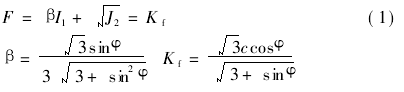 软弱地层的岩体一般表现出弹塑性性质,因而在研究该段地层时采用弹塑性本构模型。由于Drucker-Prager准则考虑了围岩静水压力对屈服特性的影响,并且能反映剪切引起膨胀的性质,因而在模拟弹塑性岩体中被广泛应用。D-P准则形式为式(1)。