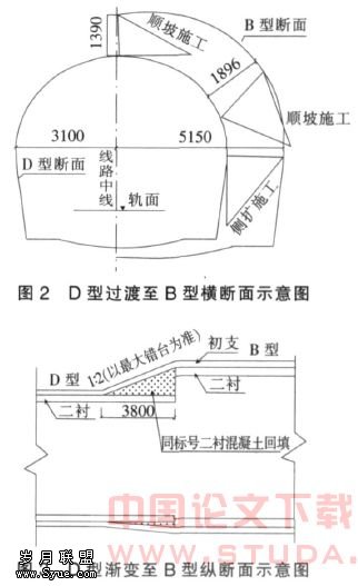 区间左线隧道从竖井往大里程方向开挖后,须直接从小断面过渡到大断面,断面间相互错台达1.6m以上。为保证土体稳定及施工安全,采取从小断面以1:2坡度喇叭口方式扩挖至大断面,以D型断面过渡到B型断面为例,一侧错台尺寸为1.8m,最大错台为1.9m。开挖方式由短台阶法过渡为CD法,设计为超前小导管支护,为保证安全过渡到大断面,采取超前护顶稳扎稳打,步步成环的可靠施工方法。断面错台采取喇叭口扩宽顺接方式,顺接长度以最大错台长度为准按1:2坡度顺接,顺扩地段设在小断面(即D型断面)内完成。待施作二次衬砌时,扩挖部分用同级二衬混凝土回填。二次衬砌内轮廓仍按台阶过渡。其横断面示意图、纵断面示意图分别见图2、图3。