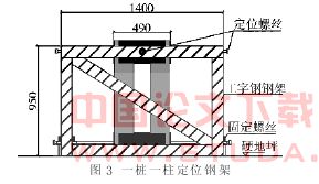 立柱垂直度的偏差控制, 是逆作法施工的技术难点之一。根据当前的工程实践, 控制立柱垂直度偏差的有效方法就是利用特制的定位纠偏架。定位纠偏架采用高强膨胀螺栓固定于硬地坪上, 利用测量仪器可将架体的中心与桩位中心重合; 利用架体下端螺栓可将立柱位置( 包括中心位置与平面转动) 准确固定; 利用架体上部的千斤顶校正立柱垂直度( 图 3) 。