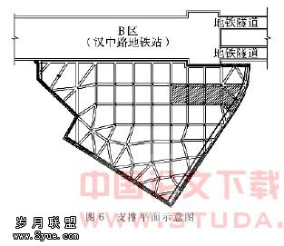A区基坑北侧的围护墙体主要利用汉中路地铁车站原施工的地下连续墙, 因此, 钢筋混凝土支撑也就直接撑在地下连续墙上, 与运行中的汉中路地铁车站共墙( 见图 2、3) 。但这里有一个前提, 必须保证地铁 1 号线的正常运营以及汉中路地铁车站的安全。