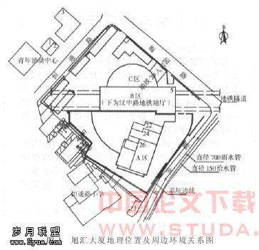 旭汇大厦工程位于上海市闸北区长安路和梅园路交汇处, 地铁 1 号线汉中路车站正上方, 该工程分为 A、B、C三个区。A区地上 26 层、地下 1 层, 地下建筑面积为 3 700 m2, 裙房底板厚度 1 200 mm, 基础挖深为 6.25 m; 主楼底板厚度 2400 mm, 基 础 挖 深 为 7.45 m( 电 梯 深 坑 局 部 挖 深 达10.55 m) 。A区原工程桩及围护墙体已于 1996 年施工完成。B区为已建 5 层框架结构, 其地下部分为已投入运营的地铁一号线汉中路车站。C区为原已建 1 层框架结构( 拟建 5 层) 。本工程属停工复建的“烂尾楼”工程(图 1)。