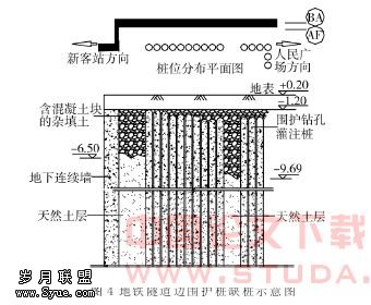 本工程 A区已于 1996 年将工程桩、围护排桩、止水帷幕大部分施工完毕。原围护桩为 mm的钻孔灌注桩, 桩顶相对标高为 - 1.50 m, 桩底相对标高为 - 13.30 m,桩外侧采用 φ500 mm旋喷桩作止水帷幕。原围护设计的围护桩桩径及插入深度不能满足现行规范和标准的要求, 场地土质又较差, 围护设计需进一步优化, 以满足现行规范及保证周边环境安全的要求。