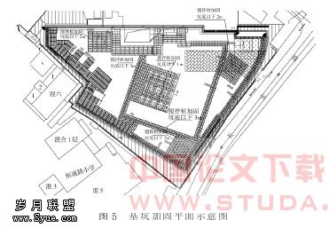基坑平面形式整体约呈不规则的三角形, 因周边围护桩于 1996 年施工完成, 不满足现行规范的要求, 且周边环境复杂, 需要对基坑进行被动土体的加固。