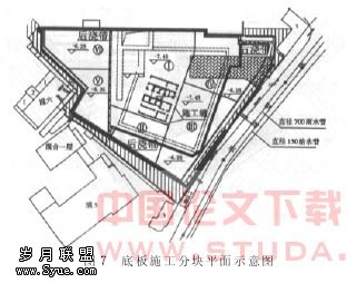 中间区域Ⅰ区第一次土方开挖至- 6.25 m并及时满浇200 厚 C20 混凝土临时垫层, 垫层浇捣后基础大底板暂不施工, 作为其它区域施工的临时堆场。Ⅱ区土方开挖, 由北向南进行分层开挖, 并及时浇捣混凝土垫层及后浇带外围底板混凝土。