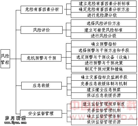 1V·G·C(Venture Manage And Control)风险管理与控制(或称风险管控)。图一:风险管控过程模型2.3 风险管控内容 风险管控的内容包括:危险有害因素分析、风险评价、危机预警与风险干预、应急救援和安全监督与管理等。实施风险管理尽量使风险处于受控状态,采取工程技术措施、安全监督管理对策和培训等手段,降低风险,减少事故的发生、降低各类损失,保护人员的安全与健康。