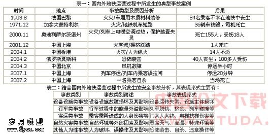 图二:风险管控内容3.地铁运营安全事故简述 从广义的角度上来说,地铁运营安全事故指的是地铁运营过程中产生的一切与地铁运营安全相关的事件;从狭义的角度上来说,地铁运营安全事故指的是地铁运营所造成的安全事故。这里是从广义地铁运营安全事故的角度加以讨论的。3.1 地铁运营安全事故分类 从国家生产安全事故分类的大角度看:根据中华人民共和国国务院第493号令《生产安全事故报告和调查处理条例》,结合中华人民共和国国务院第501号令《铁路交通事故应急救援和调查处理条例》和各地方对地铁突发事件的分类,地铁运营安全事故可分为:特别重大事故、重大事故、较大事故、大事故和一般事故等五大类。 从地铁行业特点和运营特性的角度看:根据地铁运营组织过程、运营特性和地铁运营客运服务危险有害因素,结合国内外地铁运营多发事故案例实际情况,地铁运营安全事故可分为:设备设施类事故、行车类事故、客运类事故、灾害类事故和其他人为性事故等五大类。3.2 地铁运营安全现状 我们可通过典型事故案例和事故类型分析两个方面说明地铁运营安全现状。