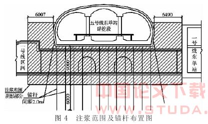 3 保护措施 根据前面的分析, 结合暗挖车站洞内施工的特殊性, 主要从调整暗挖施工顺序、对卸载范围内的既有线周边注浆、对卸载范围设置预应力锚杆和调整降水标高来控制既有隧道的隆起。而且, 在既有地铁隧道上方如此近距离施工卸载, 在国内还没有现成的经验, 对地铁安全运行的风险太大, 必须有一个准确、严密的全过程监控手段。3. 1 调整开挖衬砌施工顺序 既有线隧道的变形值随隧道上方卸载量的增大而增大, 因此如果能控制隧道上方的卸载量, 则在控制隧道隆起方面能有明显的效果, 所以有必要对开挖衬砌的施工顺序进行调整。车站的开挖采用了“中柱法”施工, 将整个断面开挖横向分为: 侧洞、柱洞和中洞共 5 个洞, 先自上而下对称施工柱洞初期支护, 再由下而上施作柱洞二衬, 建立起梁、柱支撑体系。柱洞完成后, 施工两个柱洞中间的中洞的初期支护和二衬, 形成整个大中洞稳定体系。再自上而下对称施工两侧洞的初期支护, 最后纵向分段自下而上对称施作二衬, 完成结构闭合。按照这样施工顺序, 不但减小了单次卸载量, 还可以实现在既有线上部土体开挖前先对既有线进行加固, 任一洞室初支完成后即可设置预应力锚杆、施工二衬补偿卸载。形成了加固、开挖、补偿、再加固、再开挖、再补偿……的卸载模式。开挖衬砌施工顺序见图 3。3. 2 对既有线周边土体加固 对新建车站底部及既有隧道周边的土体进行注浆加固, 提高新建车站底部及既有隧道周边土体的抗剪强度指标 C、φ等值。 (1)土体加固设计参数 在五号线暗挖段导洞内, 对一号线上下行隧道之间及侧壁 1 倍洞径范围内的土体进行注浆加固。一号线隧道加固的长度为暗挖车站下方及暗挖车站两侧各延长 6.0 和 6.49 m, 加固的深度为暗挖车站底板至以下 9 m(即一号线隧道底板以下 2.3 m); 注浆材料选用超细水泥- 水玻璃双液浆, 注浆压力 0.3~0.6 MPa。注浆加固的范围见图 4 阴影部分。