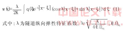 2 隆起变形预测及影响因素 在距离既有地铁隧道顶板仅 0.6 m 处进行新建暗挖车站施工卸载, 对既有地铁的安全运营构成了威胁, 需要预测既有隧道受卸载影响的纵向变形量, 并对既有隧道纵向变形量的影响因素进行剖析以提出控制措施。2. 1 用三维有限元分析预测变形 在三维地质建模和三维结构建模的基础上, 以真实的洞室群造型和地质空间分布形状, 实时建立三维有限元模型。以地质建议的岩体物理力学参数为前提, 根据开挖和支护工艺程序对洞室群进行三维弹塑性数字模拟分析。经过模拟计算, 在不采取保护措施的情况下, 既有线隧道结构最大隆起为 28 mm。参照地铁保护技术标准中关于 “地铁结构的绝对沉降量及水平位移量≤20 mm”的有关规定, 本工程既有隧道结构隆起量超过了地铁要求保护的限值, 需要采取专门的保护措施。2. 2 既有隧道纵向变形的影响因素 既有隧道周边荷载变化会引起隧道纵向变形, 但其内力分布、变形特性和影响因素非常复杂。以弹性地基梁理论为基础的解析方法概念明确,较符合隧道与土体共同作用的实际情况, 可以对影响因素进行定性的分析。根据 Winkler 弹性地基模型理论, 假设隧道为弹性地基上的无限长梁, 则隧道变形沿其纵向的分布如式(1)所示: