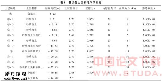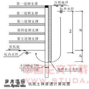 本场区地下水分布为两个主要含水层,即浅层潜水和深层承压水。 浅层潜水属孔隙性潜水类型,主要赋存于上部①层填土和②层粉土、粉砂中,补给来源主要为大气降水及地表水。地下水位随季节性变化,勘探期间测得地下水位埋深0.85~3.45m。承压水主要分布于深部的⑧-1层中细砂和⑧-3层圆砾夹卵石中,水量较丰富。隔水层为上部的粘性土层(⑤、⑥层),承压水头埋深约在地表下5m,即黄海高程3.62m。 综合场地地理位置、土质条件、基坑开挖深度和周围环境条件,本工程具有如下特点: (1)基坑开挖深度较大,最深达到18m。 (2)基坑周围地下管线密集、邻近建筑物多,环境条件较差。 (3)基坑开挖范围内主要为砂质粉土,基坑开挖时,极易产生侧向变形导致开挖面隆起而引起边坡失稳及基坑涌水等不利现象。 (4)基坑底有淤泥质粉质粘土下卧层(层面距离坑底约5m),该层物理力学性质指标尚可,渗透系数较小,对于坑底抗管涌比较有利。 总之,该工程场区地下水位高、土层渗透系数大。同时粉土粉砂地层对基坑涌水极为敏感,围护结构一旦漏水影响范围很大,因此地下水位的控制和围护结构的止水性能是本工程成败的关键。