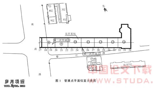 3 管涌发生情况与分析 该工程由于受拆迁及秋涛路疏解的影响,为确保总工期不受影响,将车站以秋涛路为界,分为东、西两区施工。在秋涛路中心(主体17轴处)设临时封堵墙(咬合桩墙),先封闭东区基坑,进行东区基坑开挖和主体结构施工。 东区基坑开挖自04年8月11日开始,05年1月6日结束。施工期间共出现2次管涌,第一次管涌时间为04年11月2日下午17∶10分,管涌点位于第11段基坑南侧,273#~274#桩间坑底,到20∶30分处理完共涌出泥砂约240m3左右。涌水前第11段基坑已基本开挖到设计标高,开始进行清底。273#~274#桩间渗漏处理也已接近基底。 管涌造成基坑南侧(距基坑边约20m)1户三层居民楼向北侧倾斜,围墙出现裂缝,裂缝宽度最大达10cm左右;南侧原婺江路面下沉,最大下沉量约50cm;婺江路地下自来水管开裂,造成自来水供应中断。此次管涌波及范围:273#~274#桩向南最远达44.5m,向东约39.7m,向西约12m。 第二次管涌时间为05年1月10日下午14∶10分,管涌点位于第8段基坑内,距第9段底板(已浇注完成)端头约5米处,管涌前第8段基坑垫层、防水板及细石砼保护层已施工完。到20∶10分处理完共涌出泥砂约40m3左右。处理过程中发现基坑南侧距第一次管涌点以西约10米处地面出现轻微裂缝,最大裂缝宽约5mm,长约10m,沿基坑纵向分布,影响范围向南最远达20m左右。地面最大沉降3cm。未造成其它财产损坏。 两次管涌点平面位置如图1所示,两次管涌位置的剖面图见图2和图3。