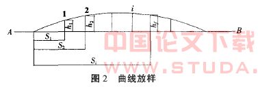 计算曲线放样点在本段弦上的投影长度Si和弓高hi,见图2.