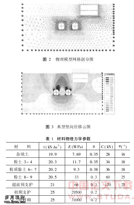 本次计算采用同济曙光有限元正分析软件进行数值分析,模型为平面模型,其网格剖分见图2。约束模型左右边界水平位移和底部边界竖向位移,上部边界为自由边界。国管局9层宿舍楼地面7层取楼层平均竖向荷载按18kN/m加载,地下两层以平面单元建模,材料取为混凝土。锚杆采用杆单元进行模拟,中隔壁、临时横撑及初次衬砌采用梁单元模拟,二次衬砌采用曙光软件内置的结合梁模拟。小导管超前支护的效果体现在拱部2m范围内预加固圈的参数适当提高,见表1材料物理力学参数表。袖阀管掌子面注浆不但可以提高掌子面的稳定性,而且对工作面周边围岩也有一定的约束作用。计算过程中采取了袖阀管掌子面注浆措施的工法(CRD法和“后CRD法”),其开挖引起的围岩应力释放率取为0.2,CD法取0.35。