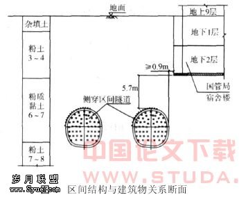 知春路站~学院路站区间位于北京海淀区知春路东段,右线起讫里程:K4+570.8~K5+485.331,长度914.531m。其中K5+375.0-K5+430.0为近距离穿越国管局宿舍楼楼段。该段呈西北-东南走向,位于由直线过渡到R=350m圆曲线的缓和曲线上。隧道埋深16m。区间近距离过国管局宿舍楼楼段,右线结构南侧外缘距离楼房地下室最小水平距离约0.9m,最小垂直净距5.7m,最近点为右K5+404.001,此处区间隧道的开挖掘进属于近接施工。图1为区间结构与建筑物关系断面图。该段区间为单孔单线马蹄形隧道,处于减震段,开挖尺寸宽6.1m,高6.64m;本工程采用矿山法施工。穿越此建筑物,是本段区间的施工重点。穿越地段国管局宿舍楼实为两座楼房,竣工于1993年。一座为砖混结构条形基础,地上6层,基础埋深约2~6m,基坑施工时采用放坡开挖,无基坑围护结构。另一座为现浇混凝土结构板楼,筏板基础,地上9层,地下2层,基础埋深约6.2m,基坑施工时采用放坡开挖,无围护结构(图1)。本文采用有限元手段对区间隧道通过9层宿舍楼的情况进行了平面数值模拟。