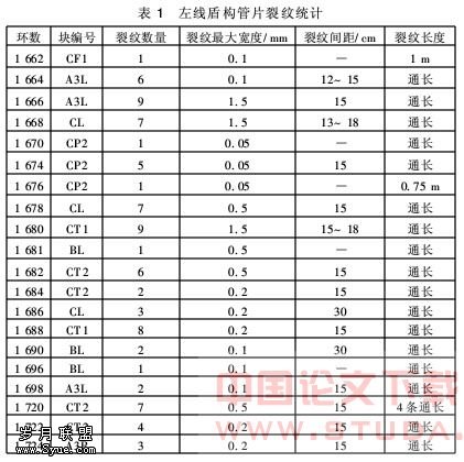 隧道投入运营快1年后,在2007年11月2日发现了左线1 662环~1 724环隧道段环号为偶数的管环管片11点位的管片内表面出现了不同程度的纵向裂纹,该受损隧道段施工时间为2005年12月17日~12月28日。具体裂纹情况如表1所示。