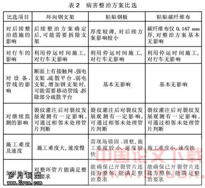 考虑到病害整治原则,对环向钢支架、粘贴钢板、粘贴碳纤维布3个方案比选如表2所示。