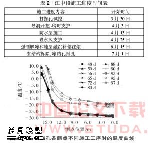 表2为江中暗挖施工工序及开始时间。当江中暗挖施工各工序施工时,必然会对冻土壁产生影响。图4是在各工序施工时内外排冻结管之间T2测温孔附近的冻土帷幕温度时程曲线,图5是在各工序施工时T测温孔测到的温度曲线。