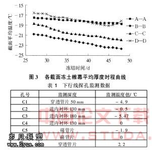 根据冻土试验报告[2],冻土壁所在土层的冻结温度在-1.0℃~1.4℃之间。冻土壁达到设计的厚度,且平均温度达到-12℃,积极冻结期才能结束,进入维护冻结期。