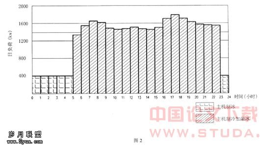 由于部分负荷蓄冷可以有效的削减高峰负荷,且初投资也较低,故此处按部分负荷蓄冷来考虑。设计时考虑充分发挥制冷主机的作用,使其昼夜运行,晚上制冰,白天供冷,以达到制冷主机容量最小的目的。