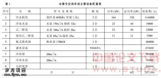 为了满足尖峰负荷需要,选择2台标准工况冷量为1173kW的制冷机组,其主要设备的配置如表2所示。