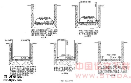 传统的气压沉箱封底工艺是在沉箱下沉到位后, 将填充物(混凝土、或砂土等)通过物料塔一斗斗地运输至下部工作室内, 同时工作室内采用人工在高气压下将填充物均匀摊铺到工作室内, 直至填满。该工艺由于人工在高气压下作业, 操作空间小, 施工环境十分恶劣, 施工效率极低。