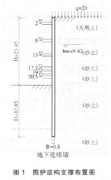 五里河站工程概况: 标准断面基坑开挖深度h=23.45m, 基坑宽度 20.8m, 采用厚度为 800mm 的地下连续墙围护结构, 墙长度为 41.3m, 墙顶标高为 0m。计算时考虑地面超载 20kPa。φik 内摩擦角标准值为 30。