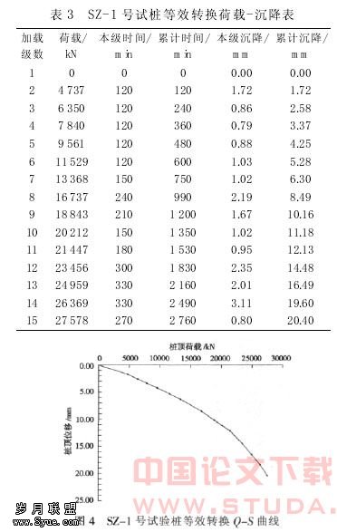 利用等效转换方法, SZ- 1 号试验桩的转换结果及曲线分别如表 3 及图 4 所示。从图中看出, SZ-1 号试桩的等效转换曲线为缓变型, 取最大沉降对应的荷载值为单桩竖向极限承载力。
