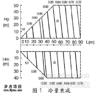 通常VRV 空调系统室内机与室外机之间是通过冷媒管连接,制冷剂管路的长度与室内外机组的高差影响着空调系统的冷量衰减。以日本大金公司的VRV 空调系统产品为例,产品说明书中介绍:室内机与室外机之间的制冷剂管长度可至150m ,室内机与室外机之间的高差可至50m, 各室内机之间的高差可允许15m。这些都是我们设计中应保证的极限值,在这些范围内设计时要注意到,随着制冷剂管长度及室内外高差的变化,其冷量衰减相差很大。大金公司给予的冷量衰减如图1。从图中可以看到:当室内机处于室外机下方,高差<10m, 制冷剂管等效长度<10m 时,容量修正系数约为1.0; 当室内外高差达到30m, 制冷剂管等效长度达到30m 时,容量修正系数约为0.9;当室内外高差达到50m,制冷剂管等效长度达到90m 时,容量修正系数约为0.72 。