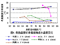 常规散热器表面温度不均匀,存在明显的“热区”和“冷区”,热媒出口附近散热器表面测试温度值明显低于热媒进口附近的测试温度值,散热器表面温度标准偏差数据比R11、甲醇、丙酮工质热虹吸散热器相应数值高得多,而且其数值随着热媒温度的升高而加大;R11、甲醇、丙酮工质热虹吸散热器表现出良好的表面温度均匀性特性,但水工质热虹吸散热器在热媒进水温度低于88℃时,散热器表面温度标准偏差值与常规散热器不相上下,热媒进水温度88℃后,水工质热虹吸散热器表现出良好的表面温度均匀性;随着热媒进水温度的升高,各种实验工质热虹吸散热器的表面温度均匀性越显著。