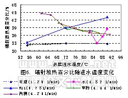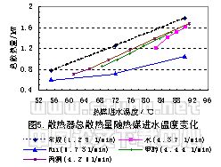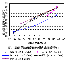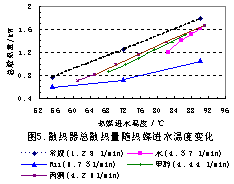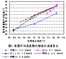 每一测试周期为60分钟,每次测试前系统热平衡时间45分钟。实验过程中,为了便于与常规散热器进行性能比较,通过调整热媒流量的办法使各实验散热器的表面平均温度对应热媒进水温度的变化基本一致;另外,对于热虹吸散热器,文献[1],工质灌注量为1250ml。测试数据经过整理后,如图3~7所示,图例说明中,“常规”、“水”、“R11”、“甲醇”、“丙酮”分别指常规散热器和热虹吸工质相应为水、R11、甲醇、丙酮的热虹吸散热器,括号中数值为各种实验散热器相应的热媒流量。