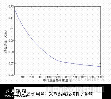 从图4中可以看出,单纯的采暖系统(不提供生活热水)经济性更差,随着热水用量的提高,综合热价迅速降低,大约在500L之后,下降趋势变缓。热水用量的增加,提高了集热器的利用率,收集了更多的太阳能,因而经济性提高。但由于在冬季,采暖和热水供应均为最不利的时期,因此采暖和热水供应没有互补性。综合热价的降低其实是由于热水系统的经济性弥补了采暖系统的不经济。