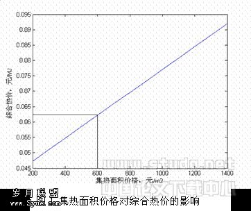 从图1上可以看出,综合热价基本上与单位集热面积的价格成线性关系。只有当每平米集热面积降低到600元时,才能与天然气锅炉采暖竞争。
