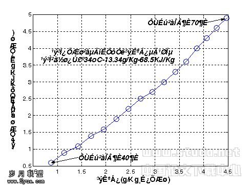 2、此外,由于新风负担所有的湿负荷,当新风比例较小时,要求转轮的除湿能力较强。目前商业转轮的单级除湿能力一般在6~12g/Kg,在室外空气含湿量较大或室内湿负荷较大时,较小的新风量可能无法满足全部湿负荷。这时可在转轮的过程空气侧增设预冷器进行冷冻减湿、分担部分湿负荷,或者增大新风量。从图2中可以看出,复合系统在新风量50%的需冷量比常规系统在10%时还要低。3、除湿转轮的焓增在一定程度降低了系统的效能。在经典的空气调节理论[6]以及大部分的工程设计中,都认为过程空气在转轮内的过程是等焓的;实际上由于蓄热效应,过程空气侧总有一定的焓增;图4为对上述的转轮得到的、当再生温度由40℃增高到70℃(过程空气侧的除湿量由0.87提高到4.47g/Kg)时,过程空气侧的焓增情况。显然再生侧的温度越高,过程侧的焓增越大。对过程侧进口焓值较低的情形,其出口的焓增可达10%。因此,制造商纷纷开发各种热容较小的材料,以尽可能降低焓增,改善效率。