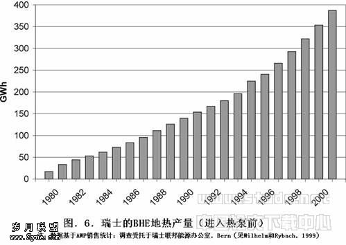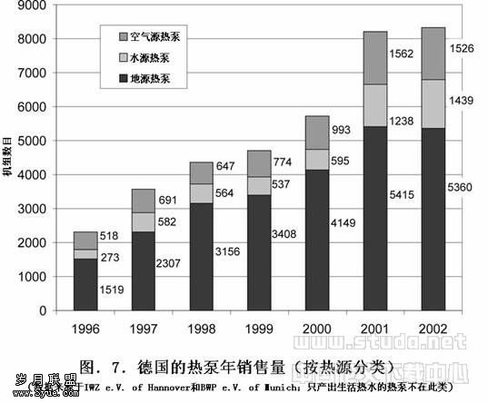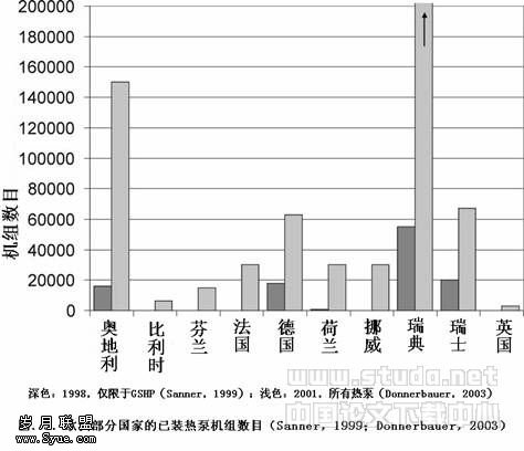 很难查明在欧洲已经安装了的热泵的可靠数目,尤其是独立的热源。图.5给出了近期欧洲几个应用热泵的主要国家已经安装的机组的数目。瑞士在2001年的数目非常高是因为有大量的废气和其他空气-空气热泵的应用,同时瑞士拥有GSHP的数目在欧洲也是最高的(见图.5中的1998年的数据)。除了瑞典和瑞士之外,就总体而言我们还是可以得出在欧洲,GSHP的市场渗透还是不高的结论(表.1)。可以预测,将来还有很多机会来深化市场的,而且这项技术的前景也支持了以上预测。瑞士庞大的装机容量的事例(图.6)给了其他国家很大鼓舞。在德国,2002年GSHP(包括了地源热泵和水源热泵)占有了约82%的装机容量,同样有着乐观的前景(图.7)。