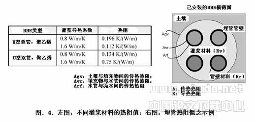 增强导热的灌浆材料在美国已有近10年的应用了,现在在欧洲也同样能买到它。这种材料的应用使得埋管热阻有了明显的降低(图.4),而埋管热阻则决定着温度恒定的地下和BHE管里面的流体两者之间的温度损失。在图.4的表格中给出了典型BHE的一些数据,通过对不同灌浆材料的BHE应用热反映测试,也能在现场证明其使用效果。