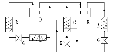 A-低压级蒸发器 B-低压压缩机 C-中间冷却器 D-高压压缩机 E-冷凝器 F-中间压力蒸发器 G-节流阀