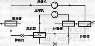 高温热泵系统所使用的压缩机目前大多数为半封闭双螺杆式和半封闭活塞式压缩机,另外也有离心式。高温水源热泵系统中采用多路独立制冷循环系统,共用一个水循环系统,可以降低设备的冷凝工作压力,增加系统的可靠性,延长系统和压缩机的寿命。在系统中一般需要设置器,以增加运行时的稳定性。系统性能匹配方面主要进行了如下工作: