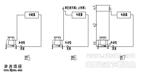 这种系统当水泵停止运行时,管道内冷却水回到塔中而形成真空,产生虹吸而倒流,冷却塔集水盘处会溢水满地。设计时一般采取一定的措施,如在冷却水管的顶端安装一个真空破坏阀,如图6。或在顶部设通气管,如图7。《暖通空调》2003年第4期《冷却塔处于系统下部时的水力分析》一文提出:当系统高度太高时,在冷却塔进水处设电动阀,以防止系统停止运行时水流空,笔者认为不如图6、7方便、简单。