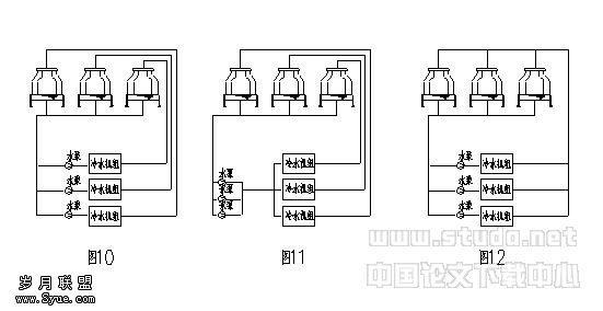 2、对于图8,10,11,各冷却塔(包括大小不同的塔)水位控制在同一高度,高差不应大于30mm。在各塔之间安装平衡管,并加大出水管的共用管段的管径。