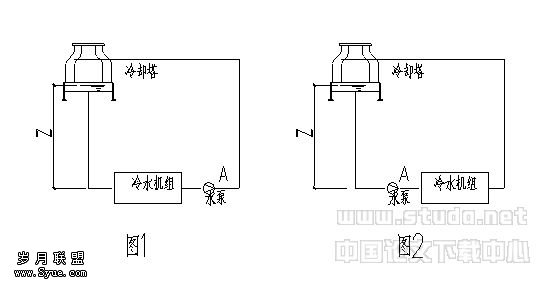 冷却塔与冷水机组之间的高差,远大于管路阻力和冷凝器阻力,并且水泵还有一个容许吸上真空高度。