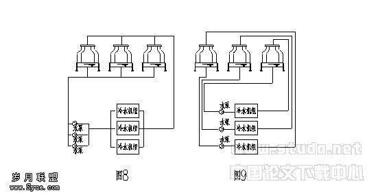 1、对于图8,每台冷却塔的进出水管上设电动阀,并与水泵和冷却塔风机连锁控制。