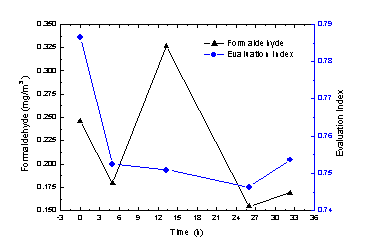 从图4中我们可以看出,甲醛与人员对环境的综合评价指标之间没有太多的相关性,这可能是由于环境参数测试房间与人员主观评价调查房间的分离造成的,也可能和人体对这种低浓度污染不敏感有关。