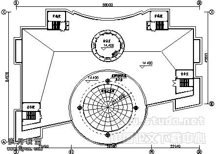 该中庭筒体直径37.0m,建筑面积1080㎡,体积15552 m3,计算排烟量为93400 m3/h;排烟风机计算风量为102000 m3/h。设计选用4台高温双速屋顶排烟风机(高速时:1450rpm,风量31421~26012m3/h,全压600~723Pa),平时需要时可低速排风,火灾时高速排烟。
